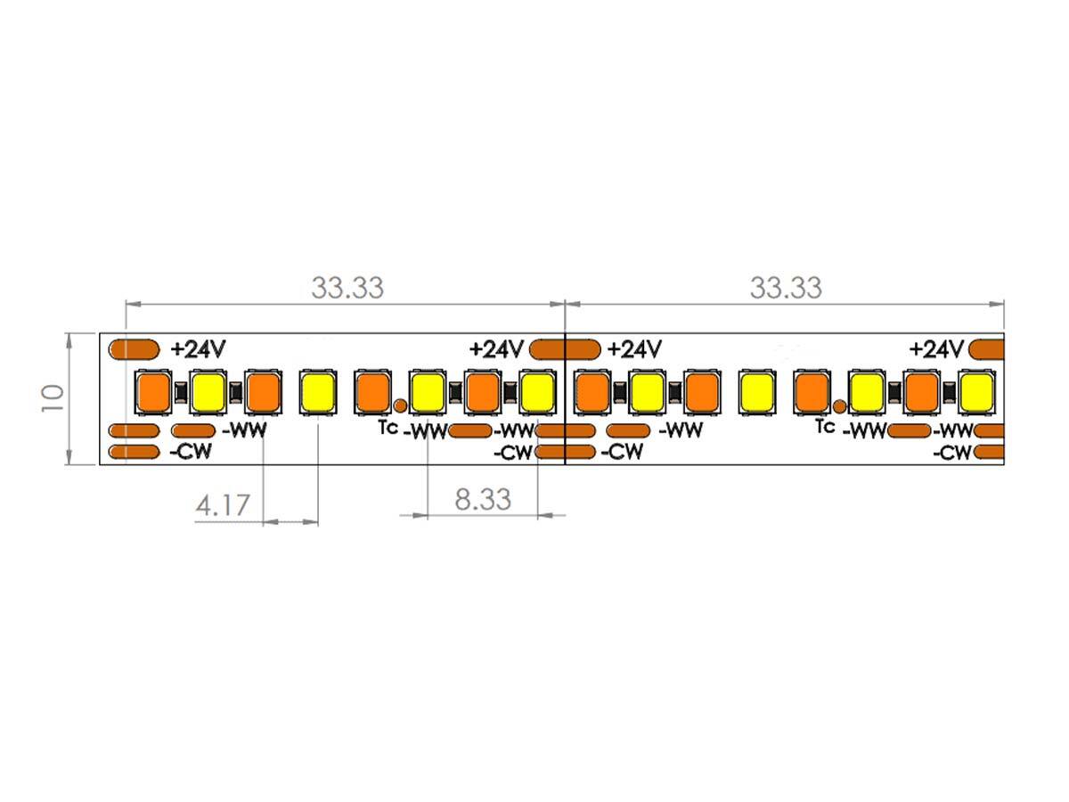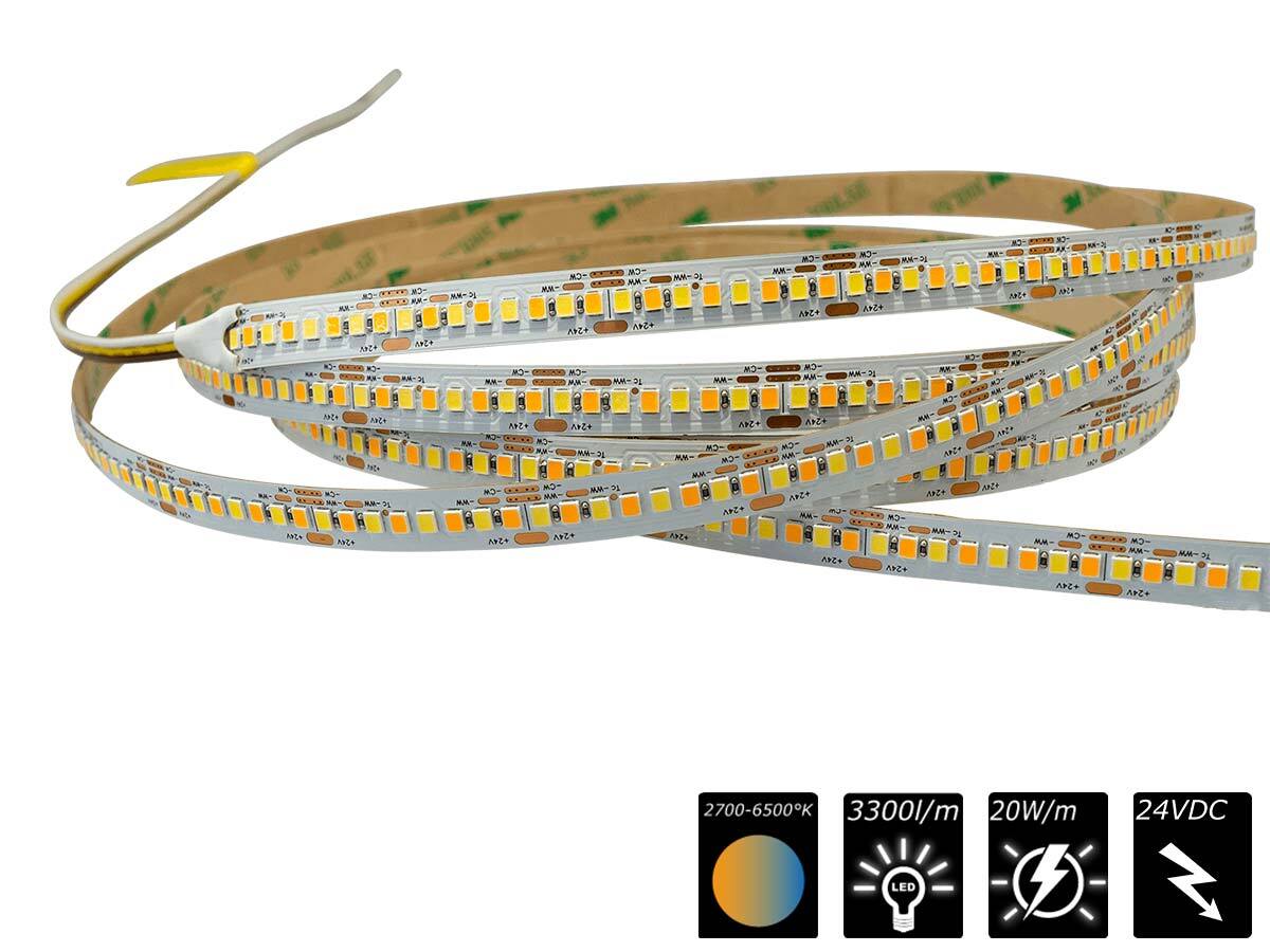 Dynamic White 2700-6500°K, teilbar alle 33.3mm (8 Chips), 24 VDC, 2x 20 Watt/m, Lichtstrom SWW 3160 + KW 3300 Lumen/m, CRI90, Common Anode, Betrieb mit max. 20 Watt pro Meter! (z. Bsp. WW 50% + KW 50% oder WW 30% + KW 70%)