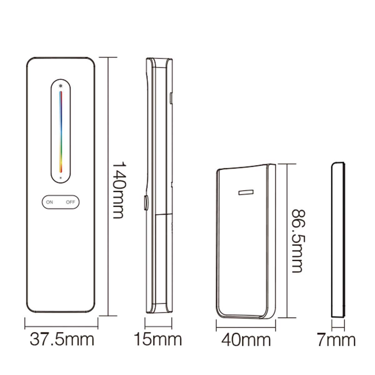Commande manuelle RGB + DYNAMIC CCT pour 4 zones, avec touches marche/arrêt, curseur pour la variation et le réglage de la couleur, tension de service 3V (2x AAA), portée d'env.30m, support magnétique inclus, dimensions : 140 x 37.5 x 15mm