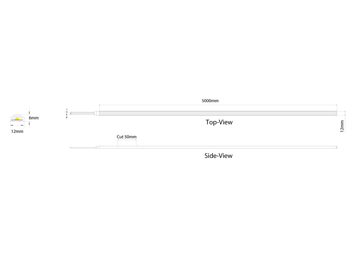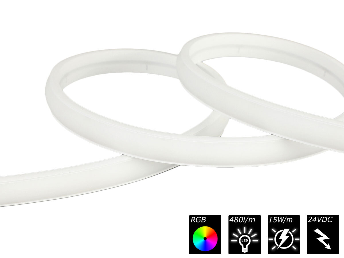 RGB COB (chip on board) with opal cover, divisible every 50mm (42 chips), 24 VDC, 15 Watt/m, R+G+B 480 L/m, common anode, protection class IP67 when correctly bonded, W: 12mm H: 6.0mm, connection included with reels
