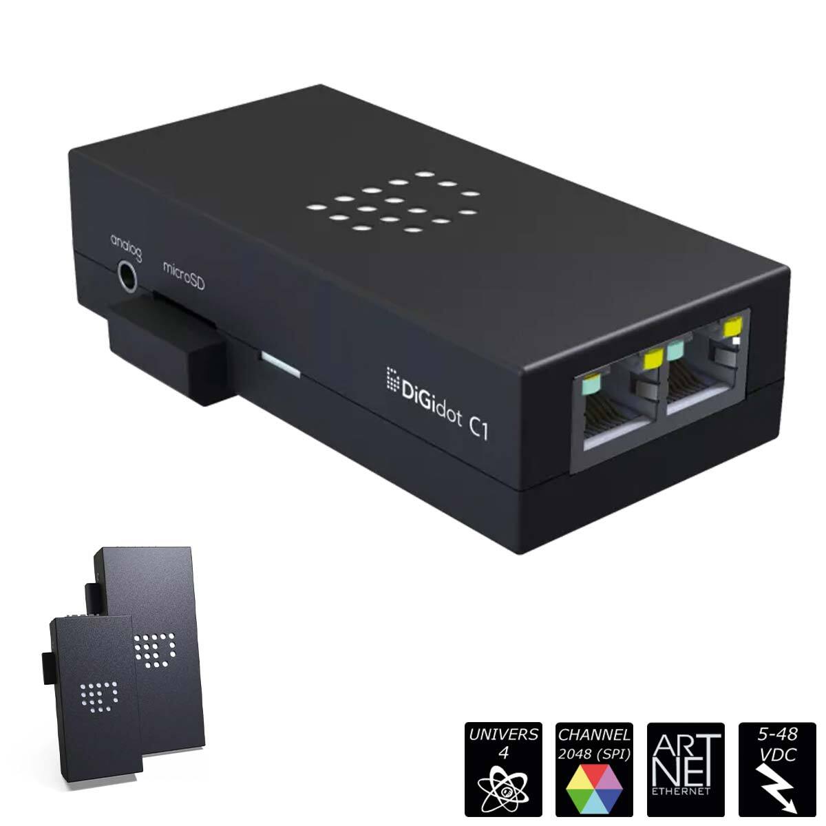 Professional small controller for digital LED strips and DMX applications, Art-Net input / output, WiFi, input protocols: Art-Net, DMX, DiGidot IOS App, UDP, HTTP output protocols: DMX, DMX TTL, up to 510 pixels per output, LED drivers: APA102, APA106, BS0901, DM412, GW6205, INK1003, LPD6803, MY9231, SK6812, TM1803, TM1809, UCS1903, UCS1904, UCS2903, UCS2904, UCS2912, UCS8904, UCS9812, WS2801, WS2811, WS2812, WS2812B