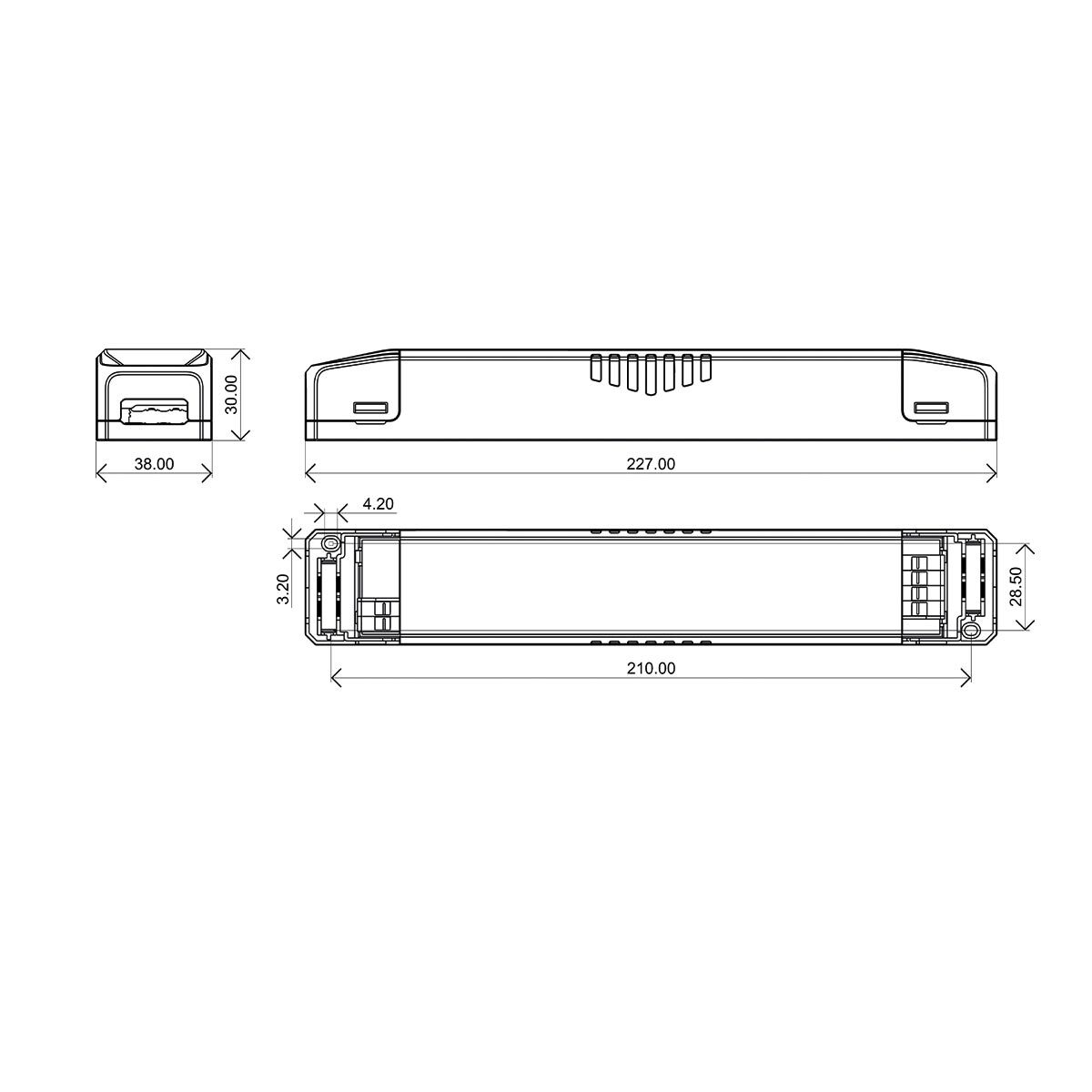Constant voltage power supply, dimmable via DALI-II or PUSH-DIM control, plastic housing, terminal connections, operating voltage 198-264 VAC, output voltage 24 VDC, output power 80 watts, MM mark / SELV, dimensions L 227mm, W 38mm, H 30mm, weight 0.3kg
