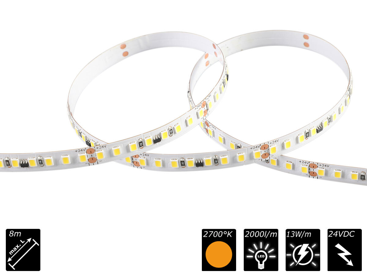 Super warm white 2700°K, divisible every 50mm (8 chips), 24 VDC, 13 Watt/m, luminous flux 2000 Lumen/m, CRI90