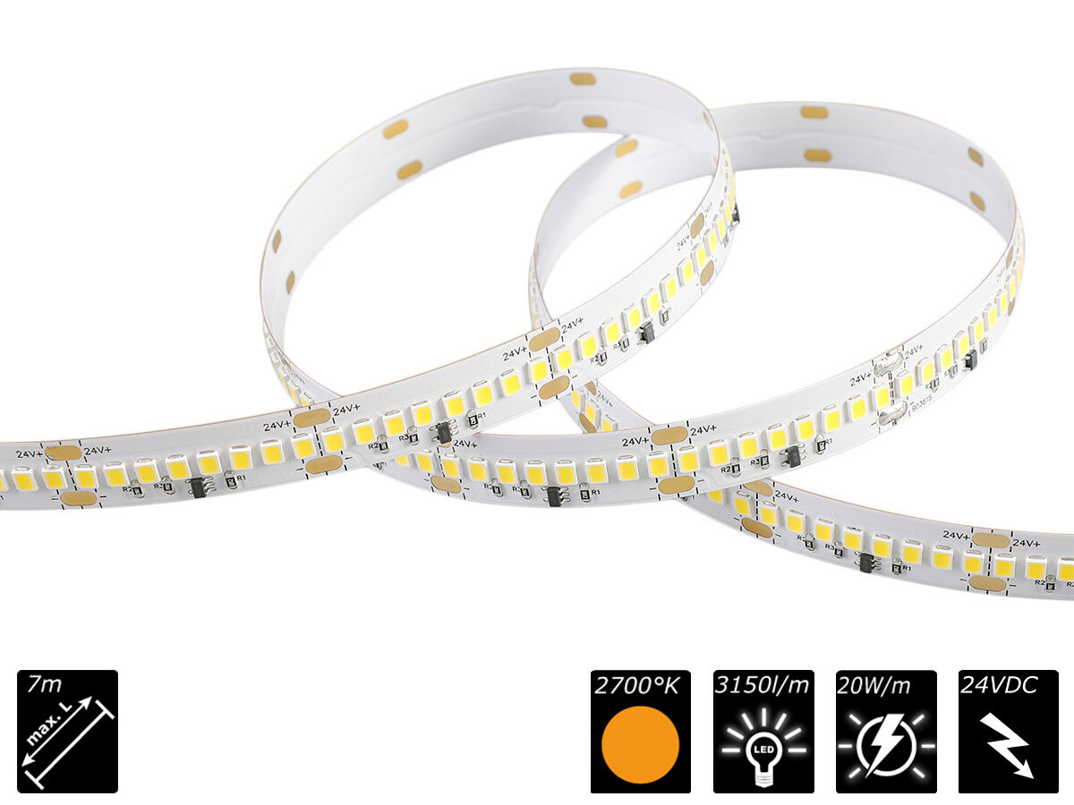 Super warm white 2700°K, divisible every 33.33mm (8 chips), 24 VDC, 20 Watt/m, luminous flux 3150 Lumen/m, CRI90