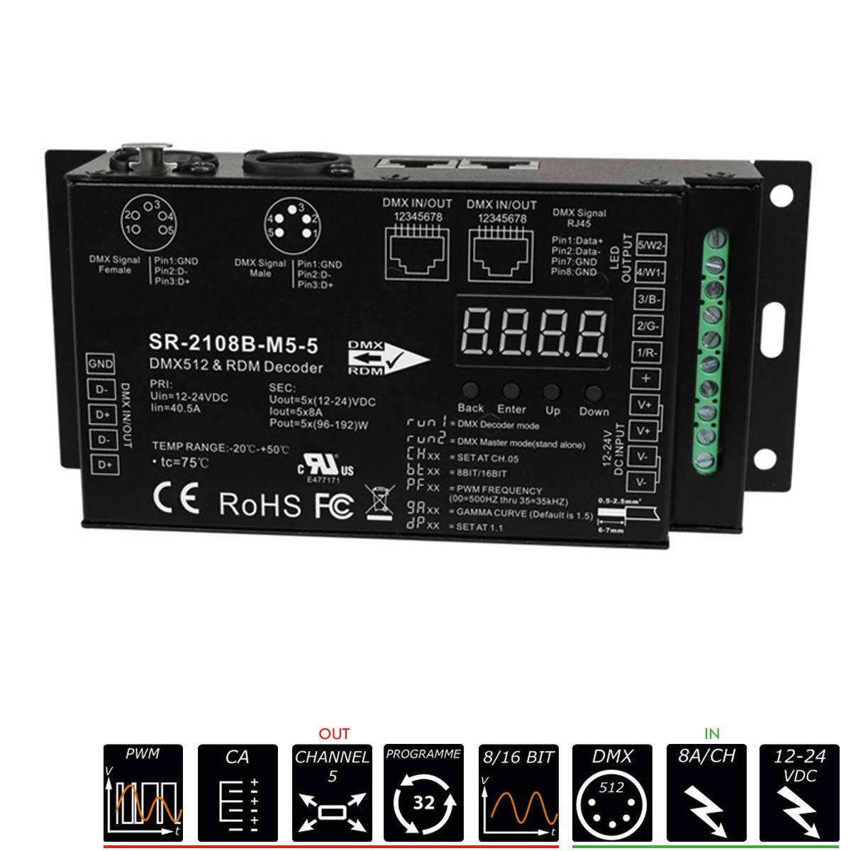 Key Features - Industrial level DMX512 & RDM decoder - Comply with the latest DMX512, DMX512(1990), DMX512-A, RDM V1.0 (E1.20- 2006 ESTA Standard) standard protocols, compatible with DMX512 master consoles from other international incorporations - Total 5 PWM output channels, common anode. DMX channel quantity from 1CH to 5CH settable - 8A 5 channels constant voltage output - Abundant DMX signal input and output port design: XLR 5pin, XLR 3pin, RJ45, Screw DMX - RDM bi-directional communication function - Enable DMX512 master console to detect decoder, display decoder information and set DMX address - Visible numeric digital display operation interface with a variety of features selection - PWM output high frequency 16bit and low frequency 8bit switchable, default setting is 16bit - 10 levels of PWM output frequency optional from 500Hz-30kHz, default setting is 1kHz - Decoding modes optional, enable to adjust brightness of each channel, master brightness of all channels and strobe effects, default mode is dp1.1 - Gamma ray curves value adjustable from 0.1-9.9, logarithmic dimming and linear dimming optional