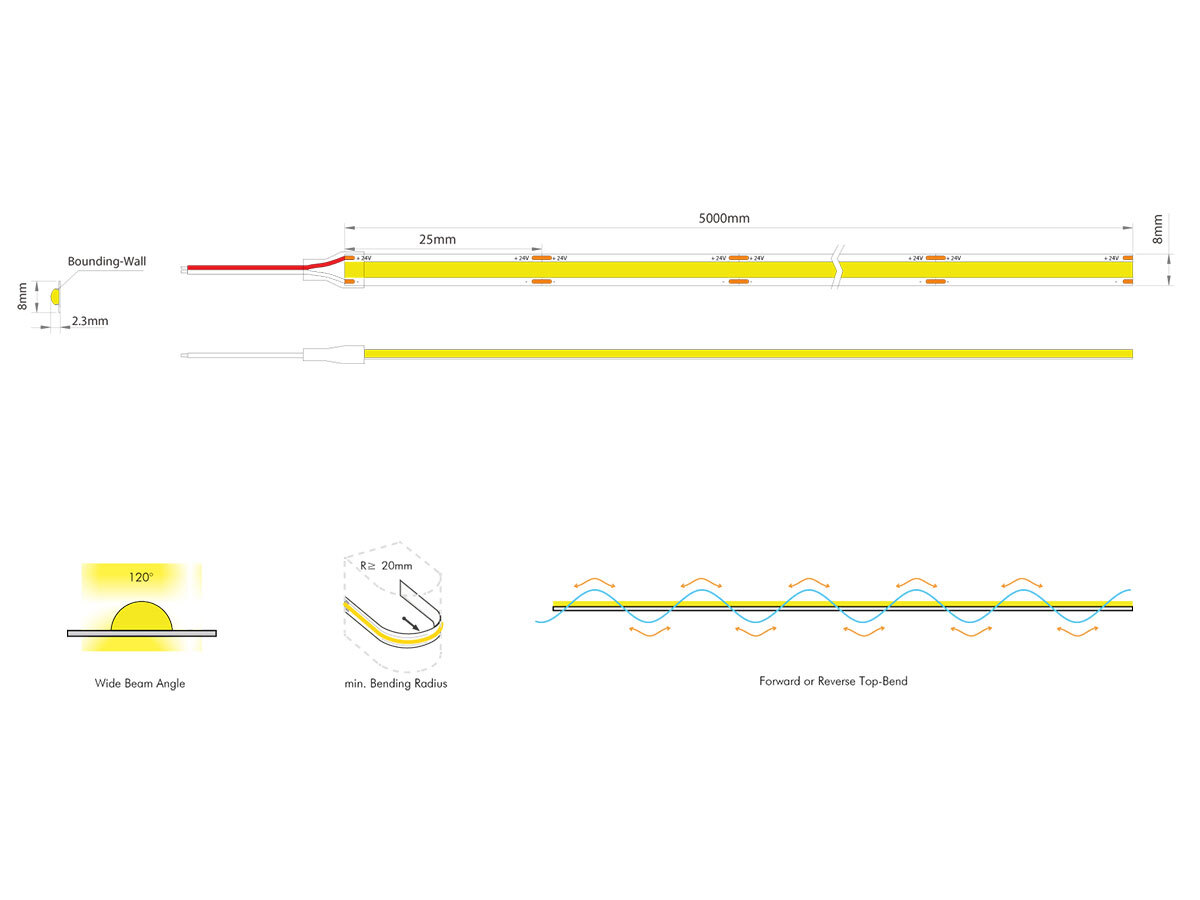 Neutral weiss 4000°K, teilbar alle 25mm, 24 VDC, 16.8 Watt/m, Lichtstrom 2150 Lumen/m, CRI90, b 8mm