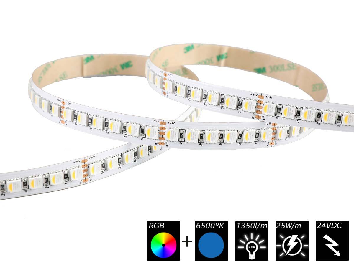 RGB+W 6500°K, 4-in-1 CHIP, 1340 Lumen/m, R=140L/m, G=370L/m, B=70L/m, W=750L/m, divisible every 50mm (6 Chips), CRI80, 24 VDC, 25 Watt/m, 120 Chips/m, width 12mm