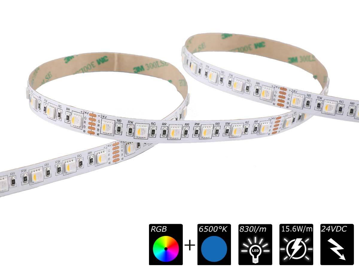 RGB+W 6500°K, 4-in-1 CHIP, 832 Lumen/m, R=95L/m, G=360L/m, B=50L/m, W=327L/m, divisible every 100mm (6 Chips), CRI80, 24 VDC, 15.6 Watt/m, 60 Chips/m, width 12mm