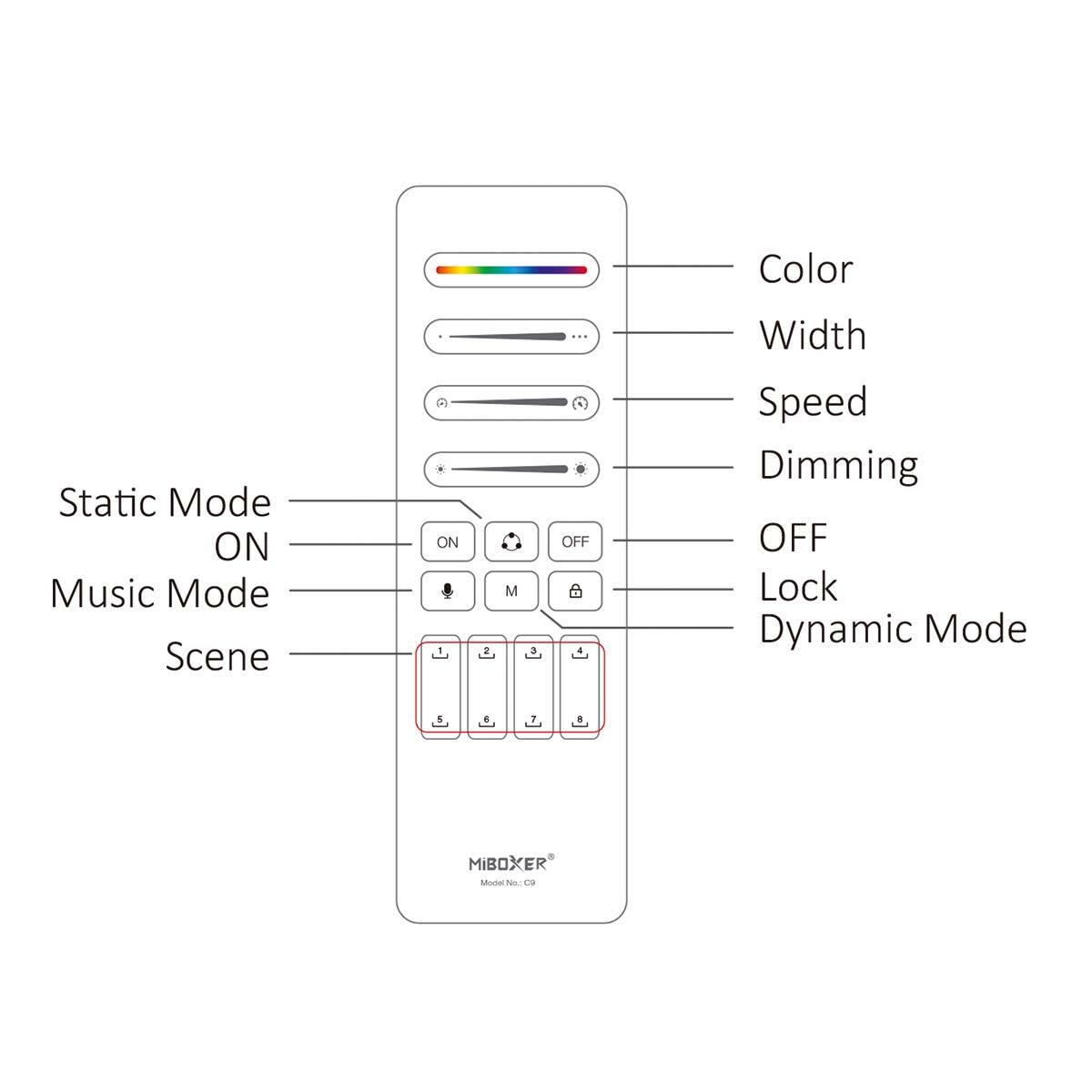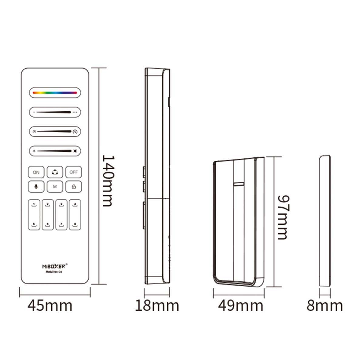 Handsender für SPI RF-HF Controller, RF 2,4GHz HF Technologie, Einstellung der Pixel Länge, wechseln dynamischer Modus sowie Steuergeschwindigkeit, Dimm Funktion, einstellen von Zeit und Farbe EIN / AUS, 8 Szenen Modi für Musik und dynamischen Modus, Betriebsspannung 3V (2x AAA), Reichweite ca.30m, inkl. Magnethalter, Abmessungen: 140 x 45 x 15mm