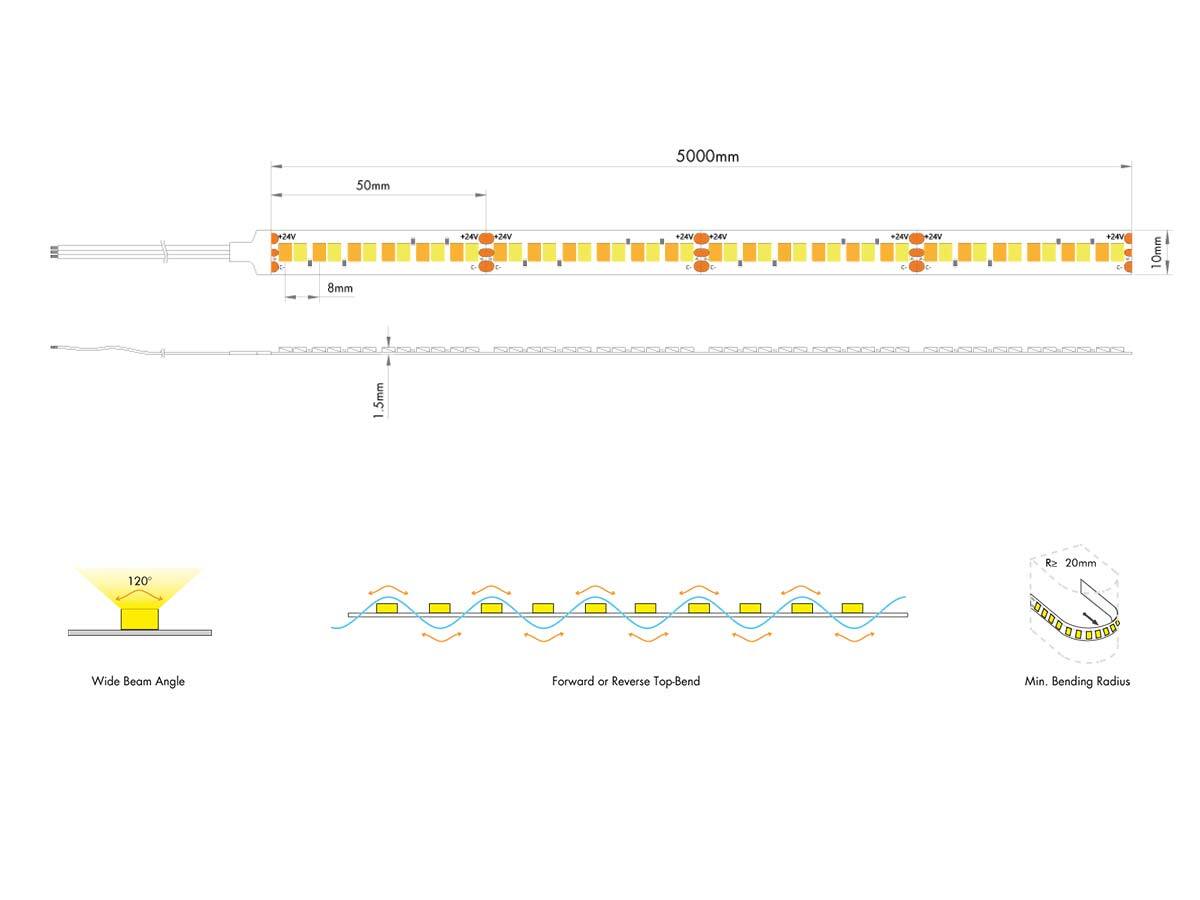 Dynamic White 2700-6500°K, teilbar alle 50mm (12 Chips), 24 VDC, 2x 18.0 Watt/m, Lichtstrom SWW 2050 + KW 2280 Lumen/m, CRI90, Common Anode, Breite 10mm, Betrieb mit max. 18 Watt pro Meter! (z. Bsp. WW 50% + KW 50% oder WW 30% + KW 70%)