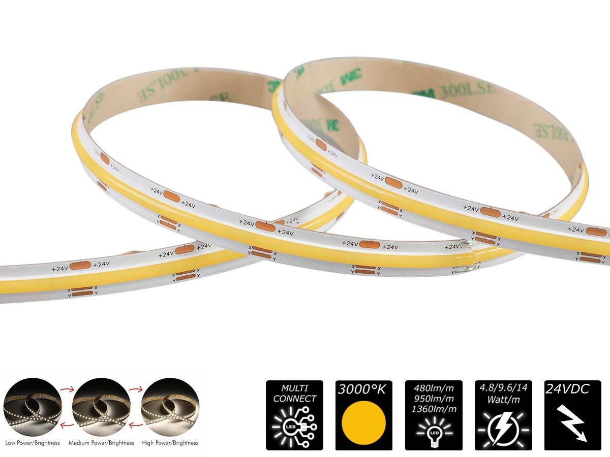 Multi-power Serie 3-in-1, Warm weiss 3000°K, teilbar alle 25mm (14 Chips), 24 VDC, 4.8/9.6/14 Watt/m, Lichtstrom 480/950/1360 Lumen/m (±10%), CRI90, Beschaltung 4.8W X+V+ / 9.6W Y+V+ / 14W Y+X+V+